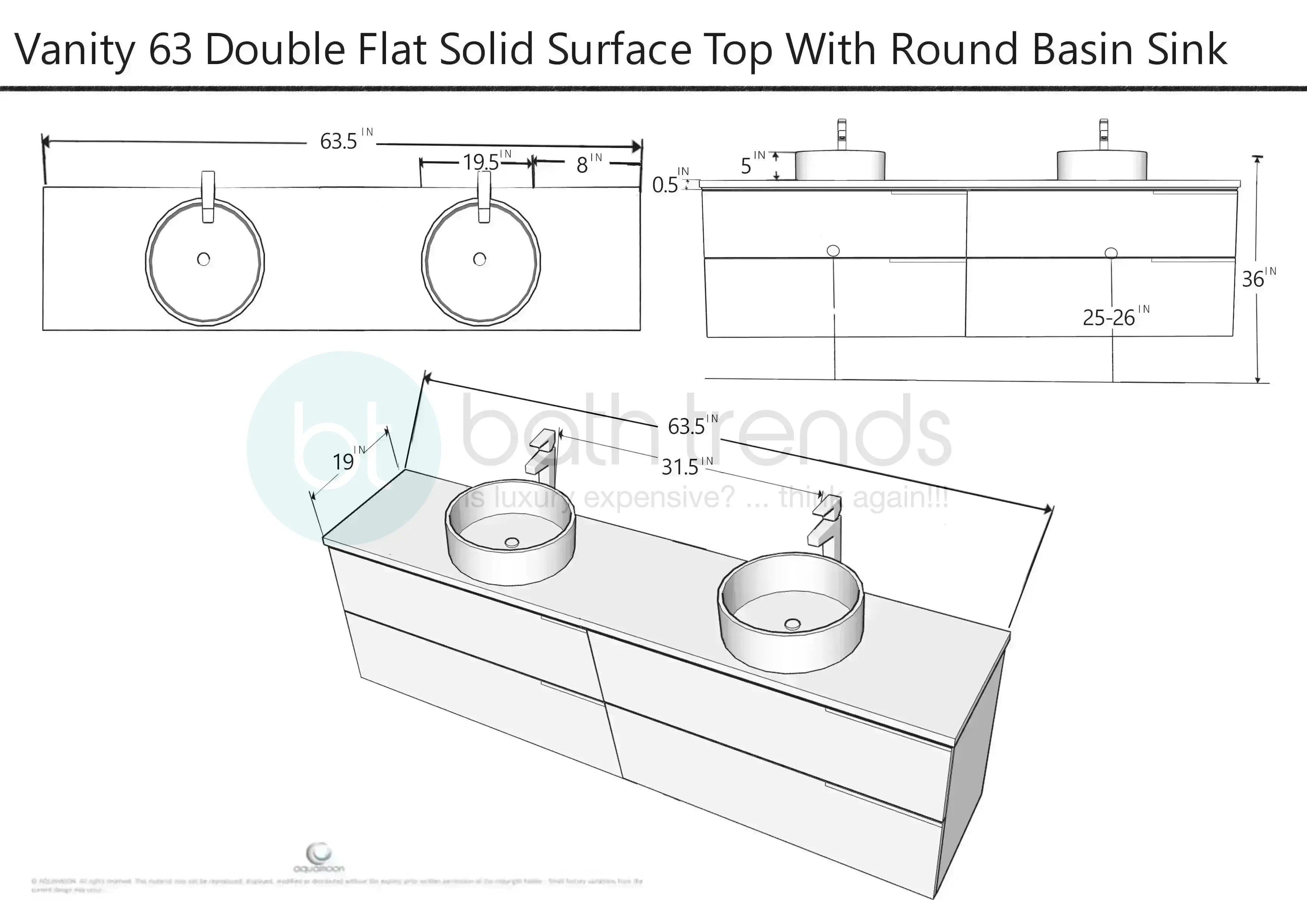 Piazza 63 Matte White With White Handle Cabinet, Solid Surface Flat Grey Counter and Two Round Solid Surface Grey Basin 1153, Wall Mounted Modern Vanity Set