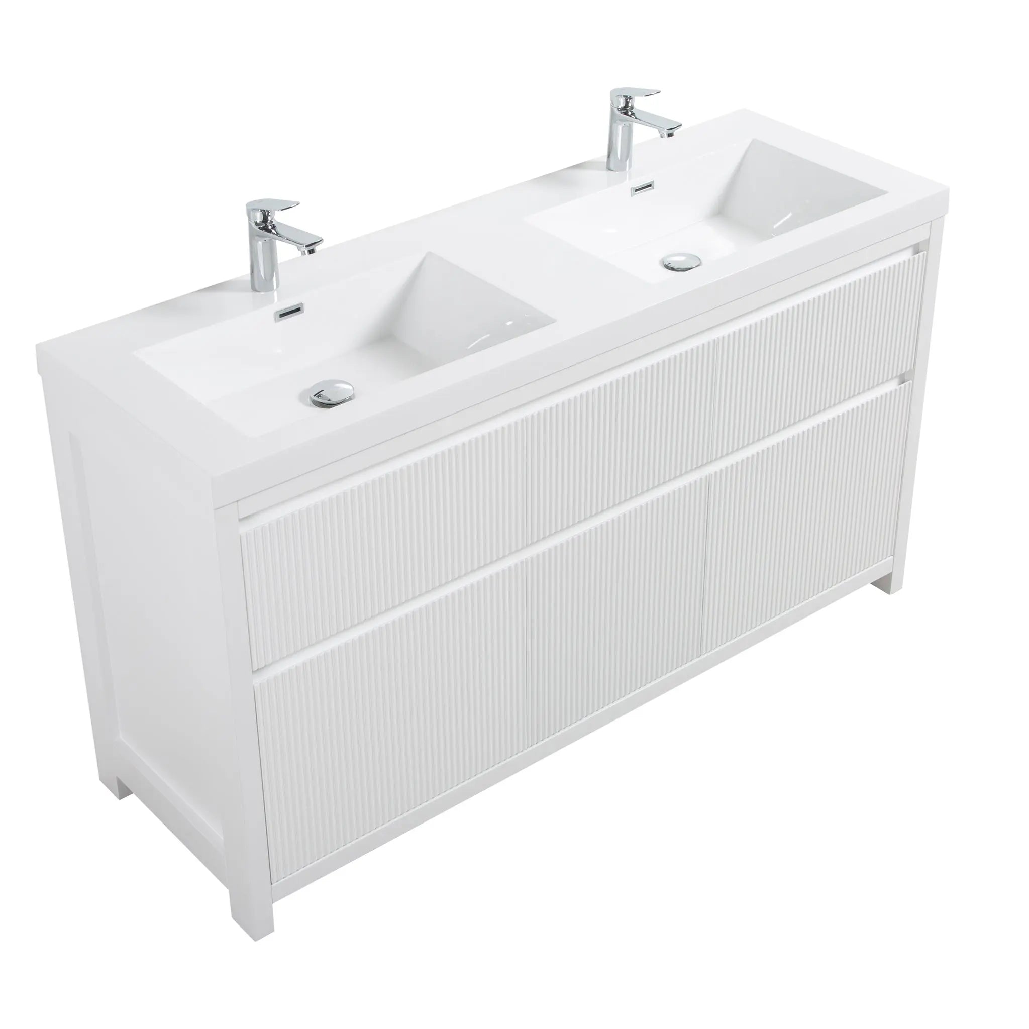 Ocean 59 White High Gloss Cabinet, Square Cultured Marble Sink, Free Standing Vanity Set