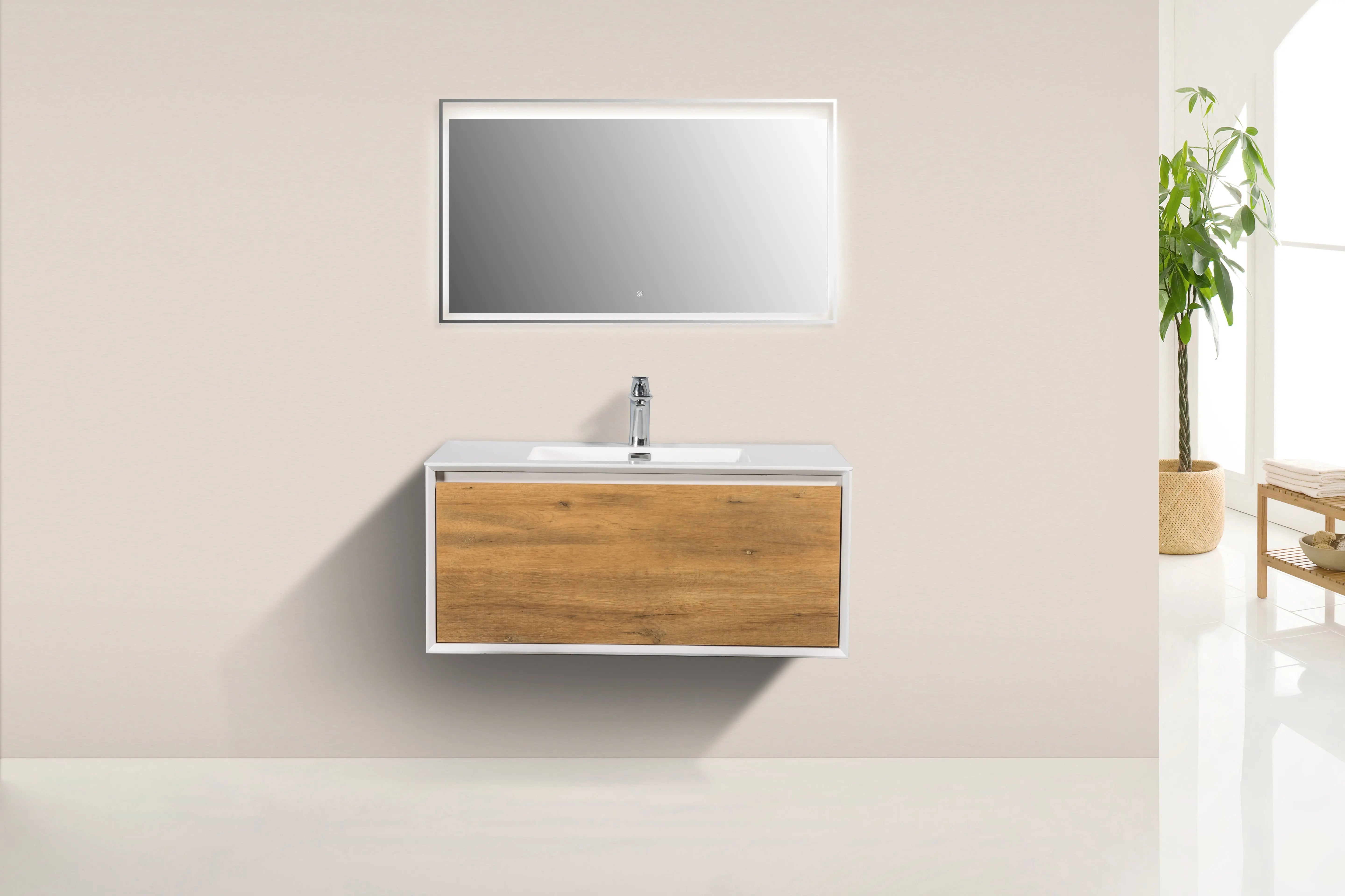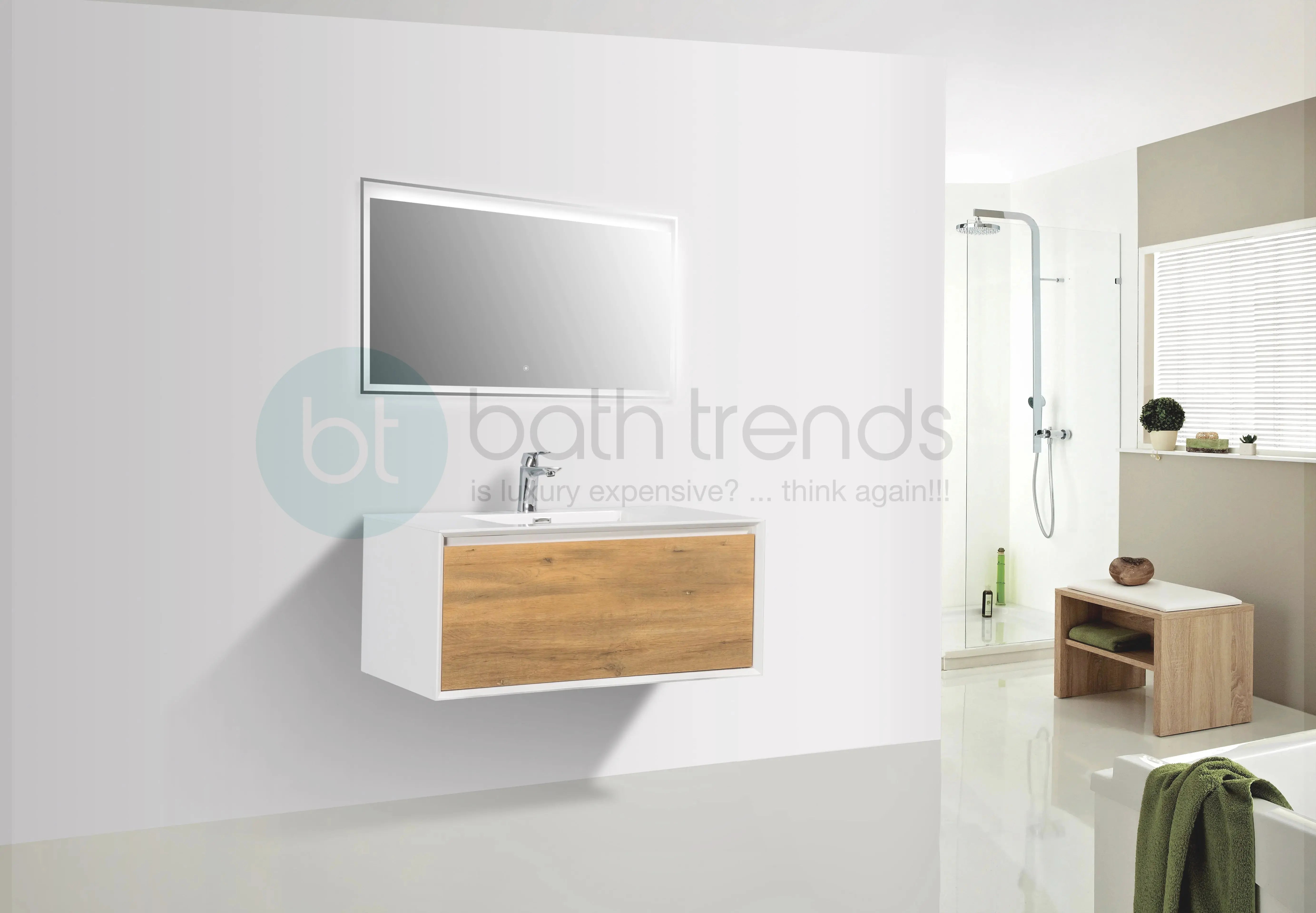 Wall-mounted bathroom vanity in a striking white and light wood finish