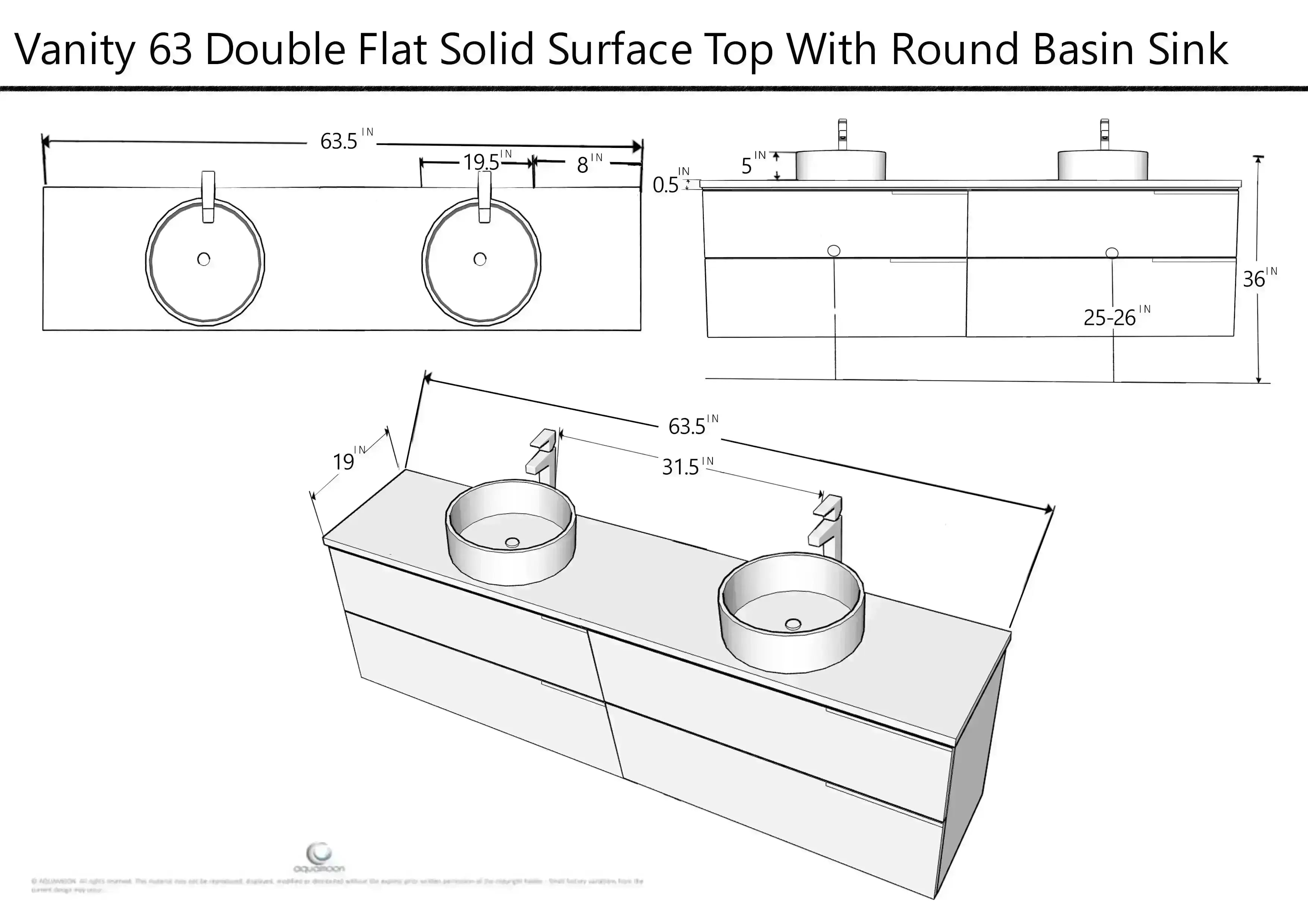 Piazza 63 Matte White With White Handle Cabinet, Solid Surface Flat White Counter and Two Round Solid Surface White Basin 1153, Wall Mounted Modern Vanity Set