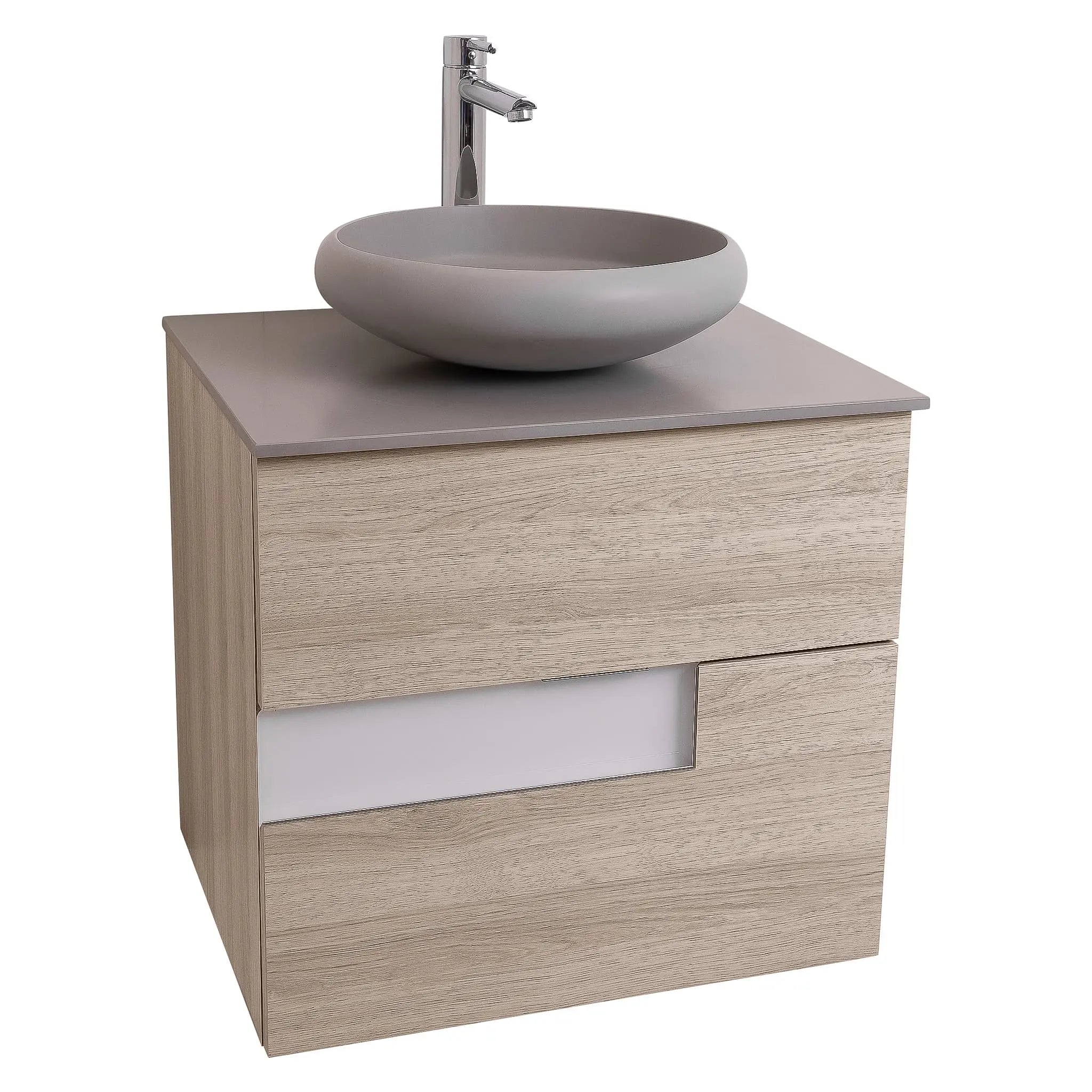 Vision 23.5 Natural Light Wood Cabinet, Solid Surface Flat Grey Counter And Round Solid Surface Grey Basin 1153, Wall Mounted Modern Vanity Set