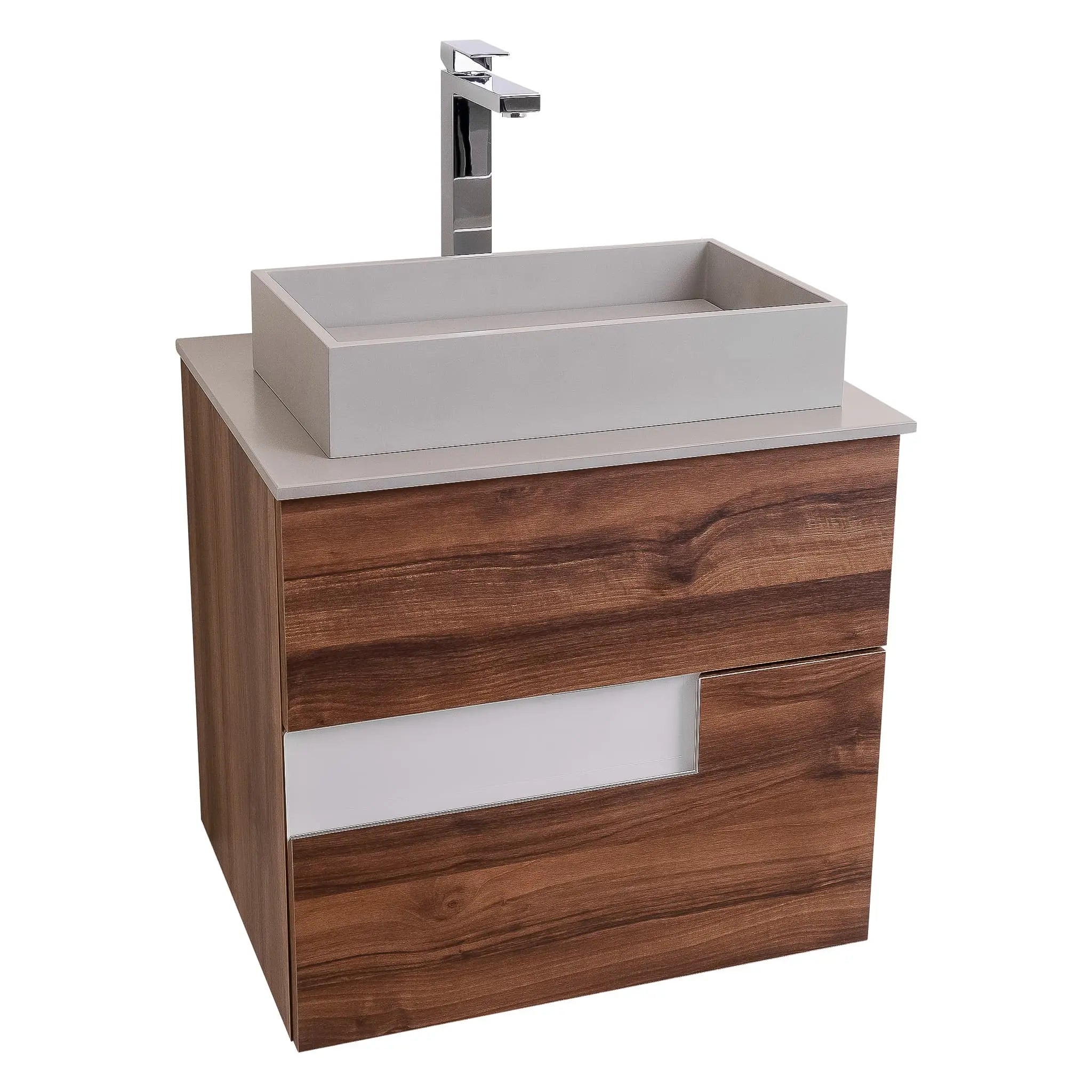 Vision 23.5 Valenti Medium Brown Wood Cabinet, Solid Surface Flat Grey Counter And Infinity Square Solid Surface Grey Basin 1329, Wall Mounted Modern Vanity Set
